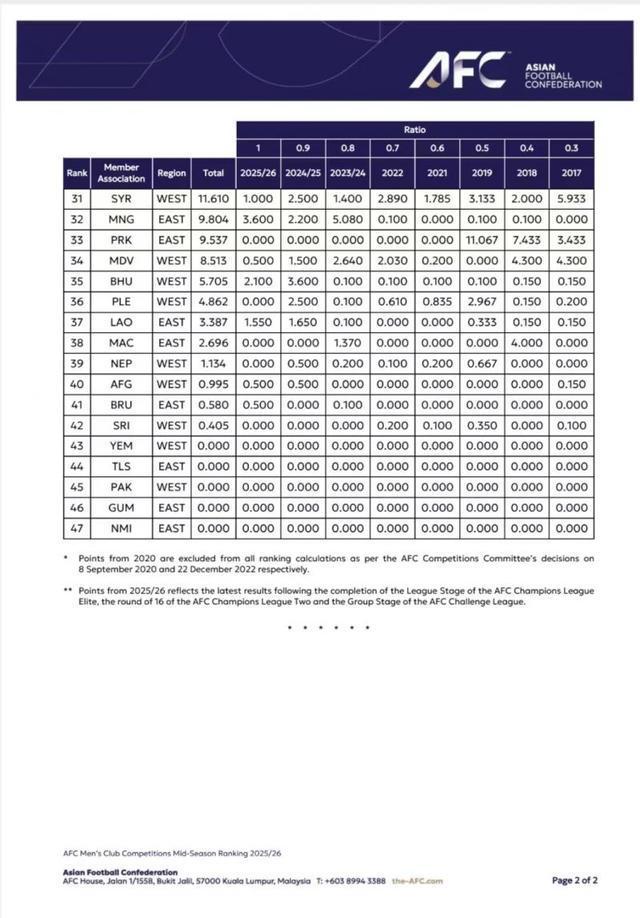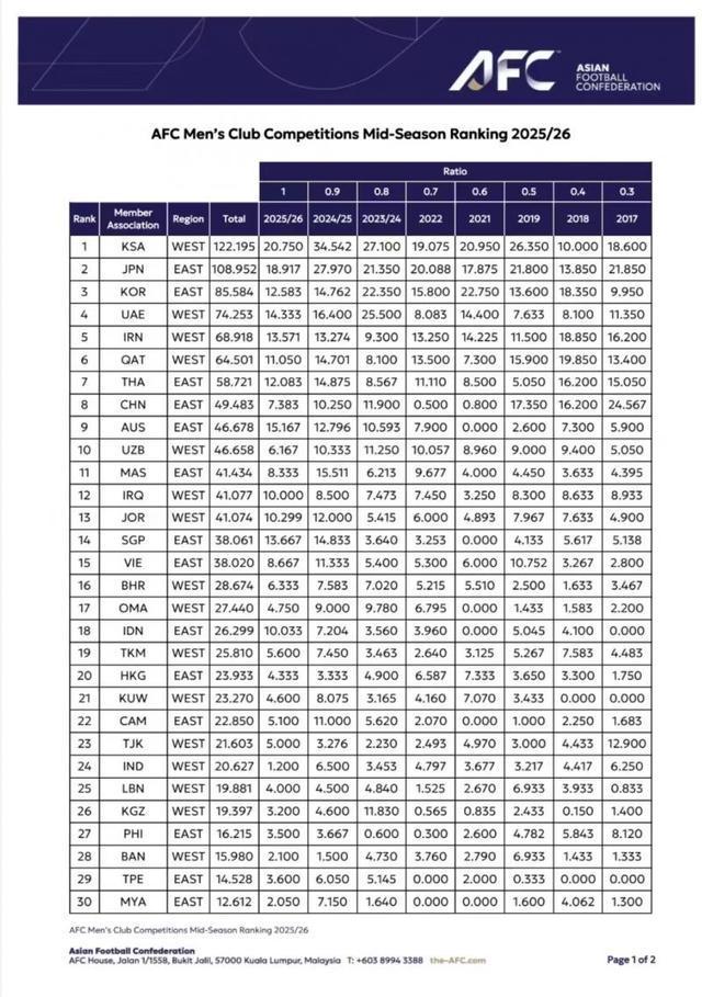 2月23日,亞足聯(lián)通過(guò)官網(wǎng)公布了2025/2026賽季亞足聯(lián)男子俱樂(lè)部賽事中期排名榜,其中沙特阿拉伯聯(lián)賽位居榜首。而同期中超聯(lián)賽僅排名第15位,在東亞大區(qū)位列暫排名第9位,雖然近8個(gè)賽季總排名暫列亞足聯(lián)第8位,東亞大區(qū)第4位,但因中超4隊(duì)已分別在亞冠精英及二級(jí)聯(lián)賽首階段賽事中“全軍覆沒(méi)”,且8個(gè)賽季累計(jì)積分僅比澳超多2.805分,因此至本賽季結(jié)束后有可能被澳超反超,從而有可能導(dǎo)致2027/2028賽季中超所獲亞冠序列賽事入場(chǎng)券被進(jìn)一步遞減。
